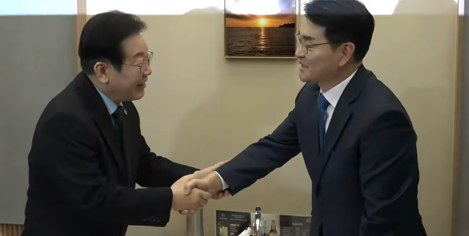 21일 서울 여의도 한 식당에서 이재명 더불어민주당과 박용진 전 의원이 인사를 나누고 있다/사진=유튜브 캡처