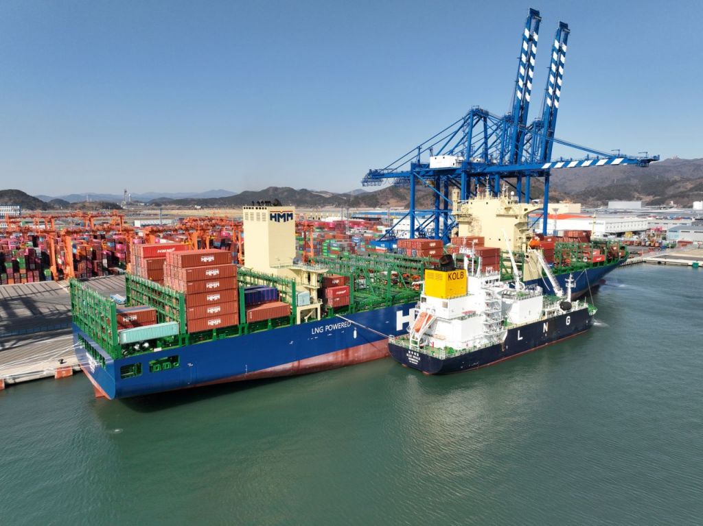 이번 벙커링·하역 동시작업은 신항 7부두(DGT)에서 진행됐다. 한국엘엔지벙커링 블루웨일(Blue Whale)호가 하역작업 중인 HMM SKY(7700TEU급)에 약 2400t의 LNG를 성공적으로 공급했다.