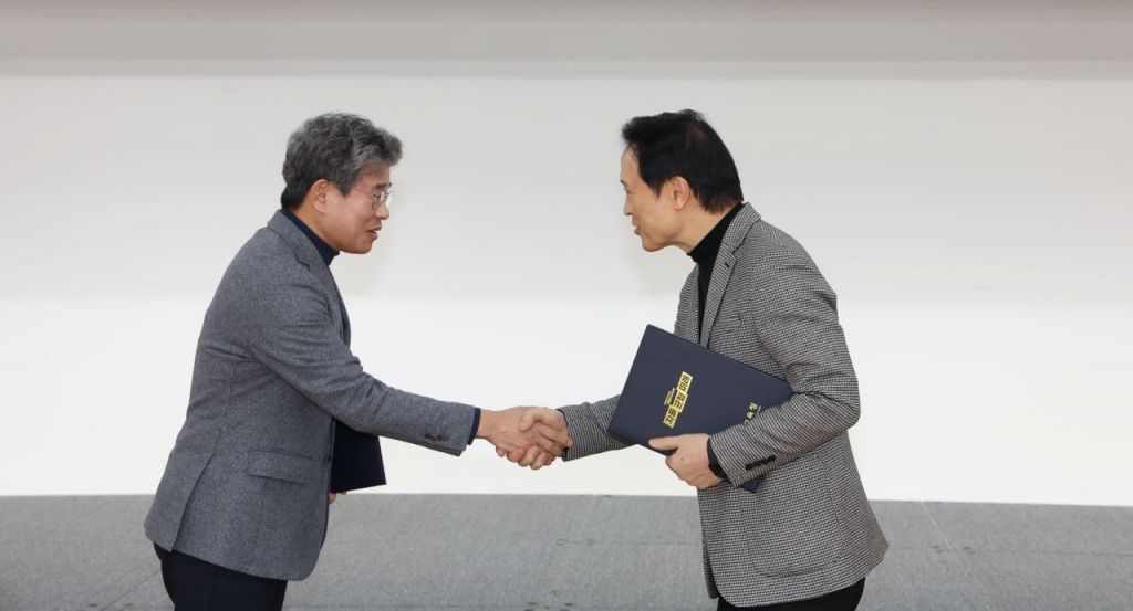 임태희 경기도교육감(오른쪽)이 21일 경기도교원단체총연합회 이상호 회장과 '교섭 협의 합의서 조인서'에 서명한 뒤 악수를 하고 있다. 경기도교육청 제공