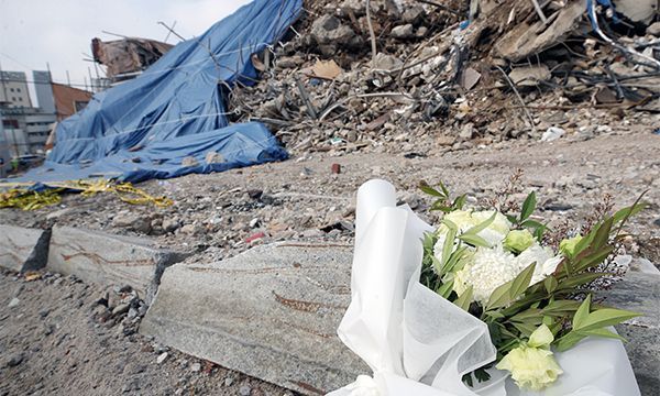 광주 동구 학동4 재개발 구역 철거 건물 붕괴 사고 현장 건너편 도로에 피해자를 추모하는 꽃다발과 손편지가 놓여있다. 연합뉴스