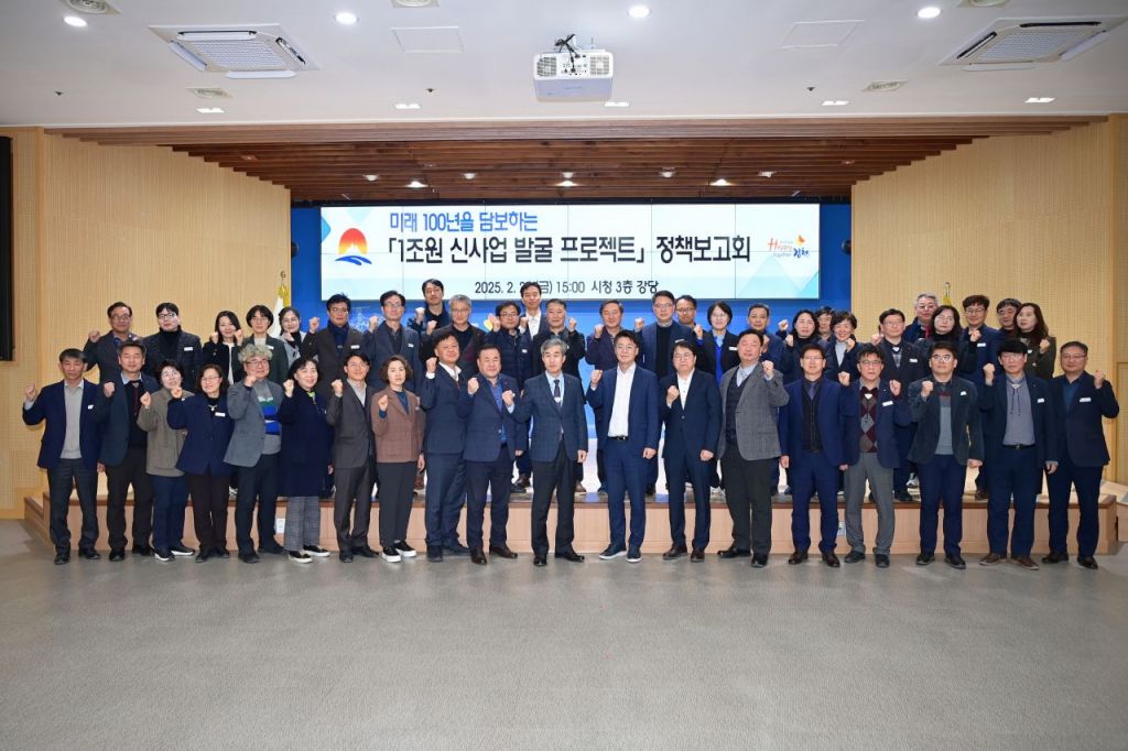 경북 김천시는 21일 시청 강당에서 ‘1조원 신사업 발굴 프로젝트’ 정책보고회를 개최하고 신사업 추진 방향을 논의 후 단체 기념 촬영 하고 있다.