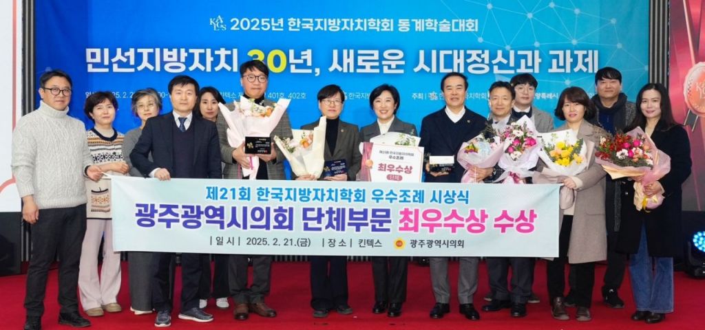광주시의회는 21일 경기도 고양시 킨텍스에서 열린 제21회 한국지방자치학회 우수조례 시상식에서 ‘최우수상’ 등을 수상하며 입법 역량을 다시 한번 인정받았다. 시의회는 올해 수상으로 지난 2004년 제1회 대회를 시작으로, 총 19회에 걸쳐 수상하는 쾌거를 이루었다.