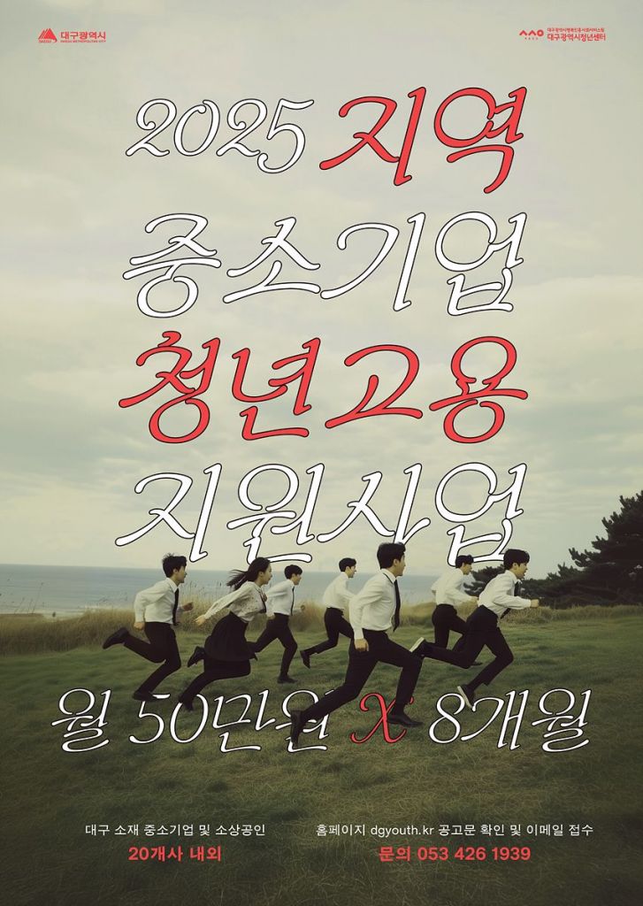 대구지역 중소기업 및 소상공인을 대상으로 기업당 1명씩 대구시 거주(예정) 청년을 신규 고용하면 8개월간 월 50만원의 인건비를 지원하고, 8개월을 근속한 청년에게는 80만원의 인센티브를 제공한다.