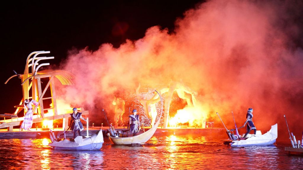 지난해 9월28일 충북 충주문화관광재단 문화도시센터와 예술불꽃화랑이 주최한 수상불꽃극 '호수 위 우주'의 공연 장면. 이 공연은 나흘간 탄금호 조정경기장에서 열려 유료 관객 4000여명을 동원했다. [사진 제공= 연합뉴스]