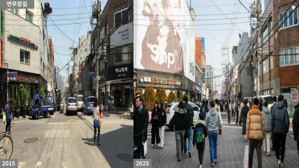 성동구는 2014년 성수동 일대 재개발 구역을 해제하는 대신 해당 지역을 도시재생 지역으로 지정하고, 성수동이 가진 고유한 산업적·문화적 정체성을 유지하며 발전하는 전략을 선택했다. 과거 공업지대로서의 정체성을 반영한 붉은벽돌 건축물을 활용한 도시재생 사업을 통해, 신축 및 증·개축 시 인센티브를 제공하는 정책을 도입했다. 그 결과, 현재 성수동에는 130개 동의 붉은벽돌 건물이 조성되었으며, 블루보틀, 이케아, 파타고니아, 키스(KITH) 등 글로벌 브랜드가 들어섰다.