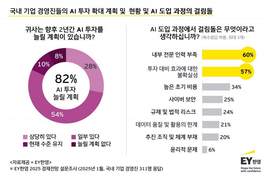 국내 기업 경영진 80% 이상이 인공지능(AI) 투자 의지는 높지만 전문 인력 부족과 투자 효과의 불확실성에 걱정하고 있는 것으로 나타났다.