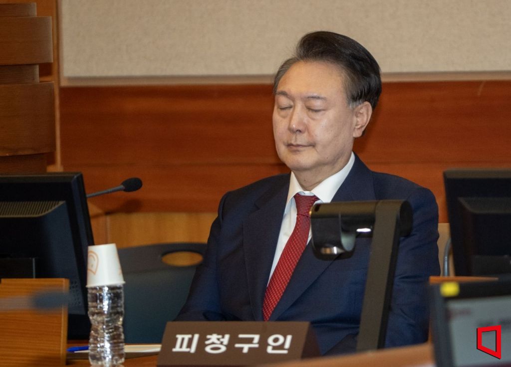20일 오후 서울 종로구 헌법재판소 대심판정에서 윤석열대통령의 탄핵심판 10차 변론이 열린 가운데 자리에 앉은 윤대통령이 생각에 잠겨 있다.<br /> 2025. 2. 20. 사진공동취재단