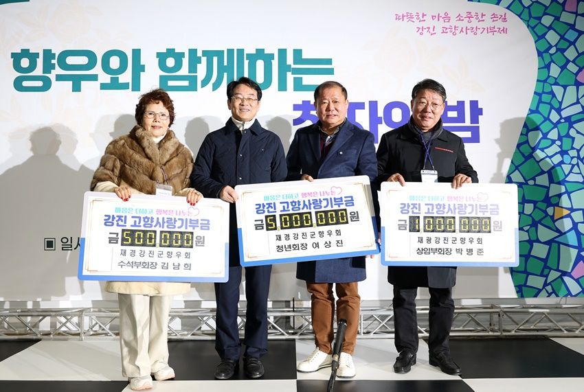 향우의 밤에 참석해 고향사랑기부금과 군민장학금을 기탁했다. 강진군 제공