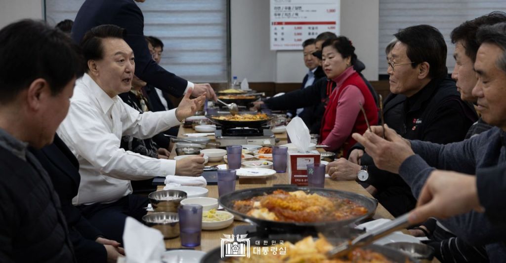 윤석열 대통령이 의정부제일시장 상인들과 함께 시장 인근에서 의정부를 대표하는 음식인 부대찌개로 오찬을 하고 있다. 2024.0.15. 대통령실 제공