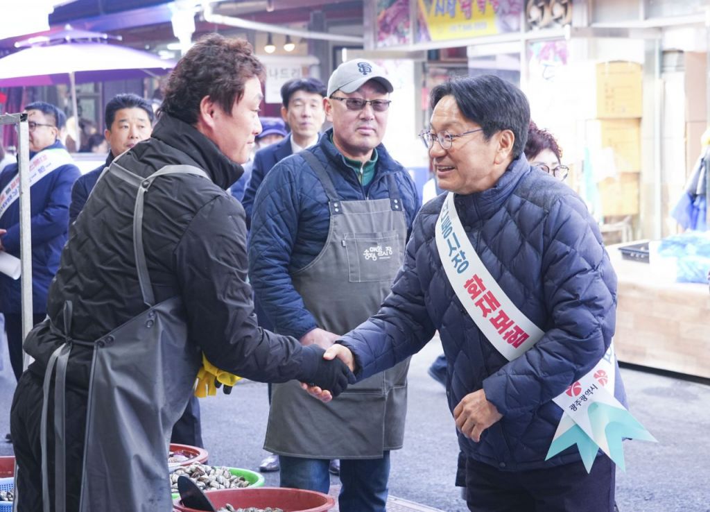 강기정 광주시장이 설 명절을 앞두고 지난달 21일 광산구 송정매일시장을 찾아 상인들을 격려하며 전통시장 화재공제 가입 캠페인을 벌이고 있다. 광주시 제공