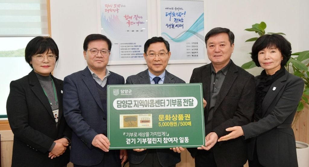 담양군은 24일 기부 걷기 챌린지 ‘1억보 걷기’를 달성, 지역아동센터협의회에 문화상품권 250만원을 기부했다. 담양군 제공