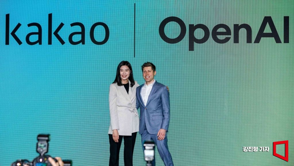 챗GPT 개발사 오픈AI 창업자인 샘 올트먼 최고경영자(CEO)와 정신아 카카오 대표가 4일 서울 중구 플라자호텔에서 열린 '카카오 미디어데이'에 참석해 사진촬영 하고 있다. 강진형 기자