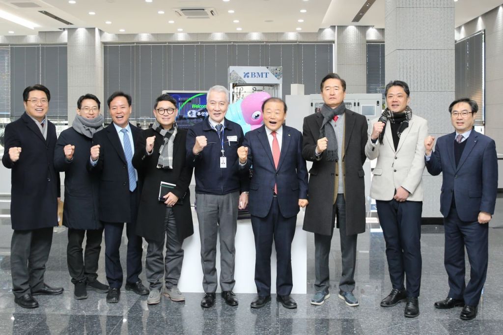 양재생 부산상의회장과 (주)비엠티 관계자들이 기념 촬영하고 있다. 부산상공회의소 제공