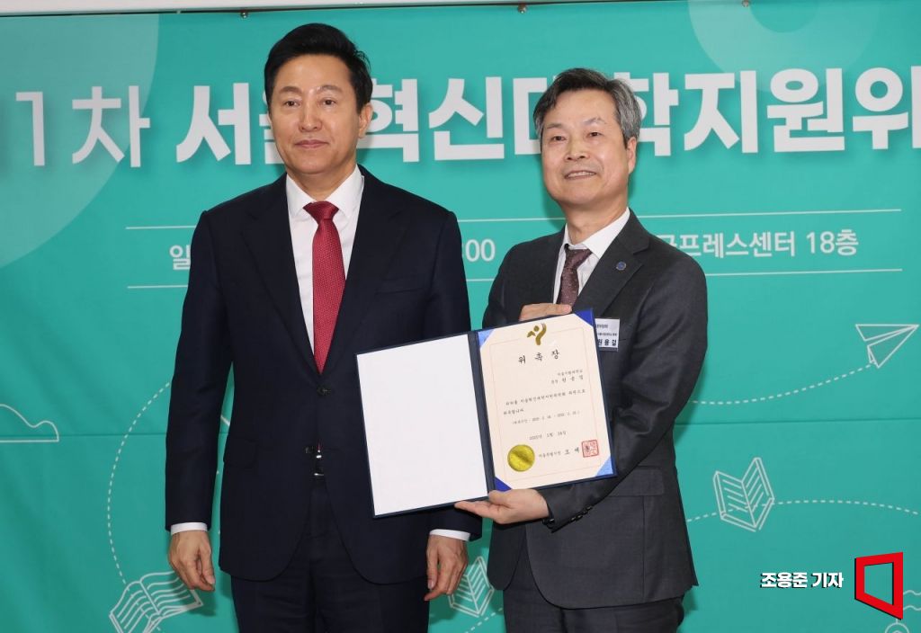 오세훈 서울시장(왼쪽)이 24일 서울 중구 프레스센터에서 열린 제1차 서울혁신대학지원위원회 회의에서 공동위원장에 선출된 원용걸 서울시립대 총장에게 위촉장을 수여하고 있다.