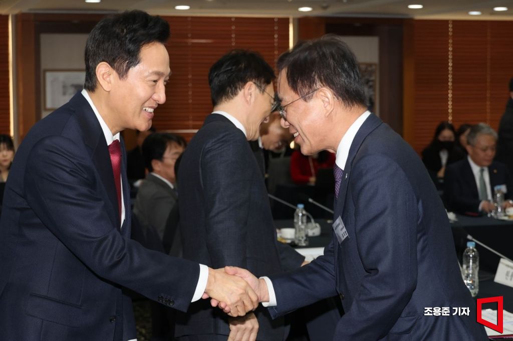 오세훈 서울시장이 24일 서울 중구 프레스센터에서 열린 제1차 서울혁신대학지원위원회 회의에서 참석자들과 인사를 나누고 있다.