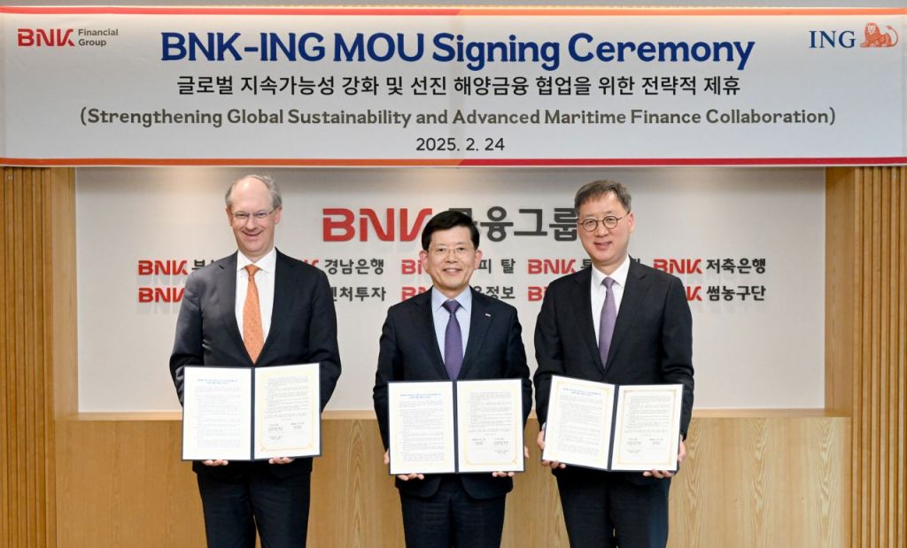 BNK금융지주가 부산은행 본점에서 ING은행과 전략적 제휴 양해각서(MOU)를 체결했다고 24일 밝혔다. 해상풍력 및 선박금융 등 신재생에너지 분야를 시작으로 부산 신공항 개발, 북항 재개발, 우주항공 복합도시, 스마트 물류 도시 등 글로벌 허브 도시를 지향하는 지역경제 활성화와 연계된 금융 지원을 중점적으로 추진한다.