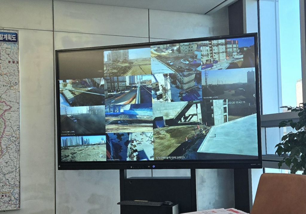 콘크리트 구조물 위에서 철근을 고정하는 작업자들, 분주하게 오가는 공사 차량, 작업 중인 대형 크레인과 중장비들. 100인치 대형 TV 속 13개 내외로 분할된 화면에서 건설 현장을 비추는 실시간 감시 카메라(CCTV) 영상이 수초 단위로 바뀌고 있었다. 각 화면 상단에는 현재 날짜와 시간이, 하단에는 해당 건설 현장 구역명이 표시돼 있었다.