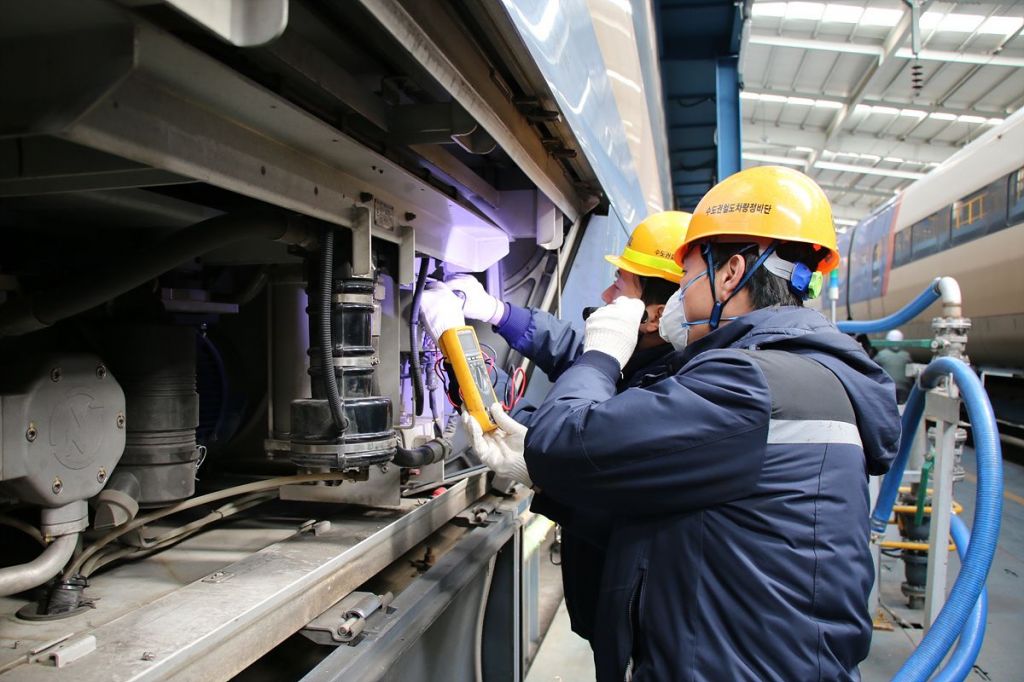 코레일 직원들이 24일 수도권차량정비단에서 KTX-청룡 하부의 부품상태를 점검하고 있다. 한국철도공사 제공