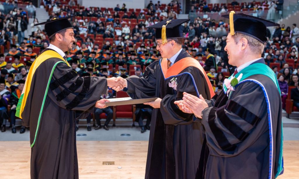 권진회 총장은 학위수여식사에서 중국 송나라 유학자 주자(朱子)의 ‘소년은 늙기 쉬우나 학문은 이루기 어려우니, 한순간도 헛되이 보내지 말라.’라는 말을 인용하며 “새롭게 펼쳐지는 무궁무진한 지식의 세계, 광대무변한 지혜의 광장에서 어쩌면 여러분은 아직 소년일지도 모른다”면서 “한순간도 인생을 낭비하지 말고 끊임없이 배우고 또 배우라”라고 당부했다.