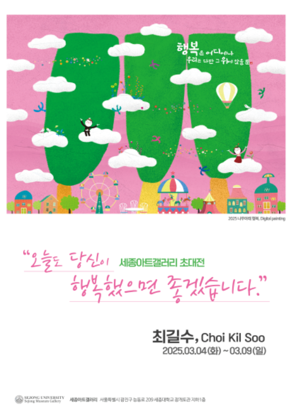 세종아트갤러리는 3월4~9일 최길수 작가의 초대전 ‘오늘도 당신이 행복했으면 좋겠습니다’를 개최한다고 26일 밝혔다.