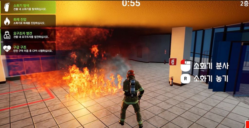 소방 훈련 콘텐츠는 최대 20명이 동시 접속해 4인 1조로 역할을 수행하며, 3D 모델링된 건물 내에서 화재 진압 및 인명구조를 다양한 방법으로 반복할 수 있도록 설계해 소방관의 위기 대처 능력을 향상할 수 있도록 했다.