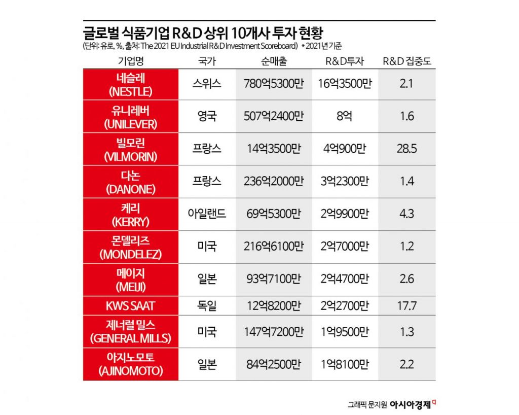 이같은 목표는 국내 식품업계 1위인 CJ제일제당의 지난해 매출 및 R&D 규모와 비슷한 수준이다. CJ제일제당은 지난해 대한통운을 제외한 연매출이 17조8700억원이었고, R&D 비용으로 2180억원을 쓰면서 매출 대비 비중은 1.22%였다.