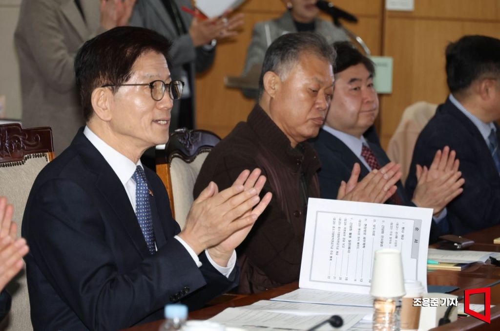 김문수 고용노동부 장관이 26일 서울 영등포구 근로복지공단 서울합동청사에서 열린 중소기업퇴직연금기금(푸른씨앗) 1조원 돌파 축하 박수를 치고 있다.