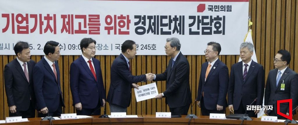 26일 국회에서 열린 주주 권익 및 기업가치 제고를 위한 경제단체 간담회에서 국민의힘 권영세 비상대책위원장이 김창범 한국경제인협회 부회장으로부터 상법 개정에 대한 경제8단체 건의문을 전달받고 있다.