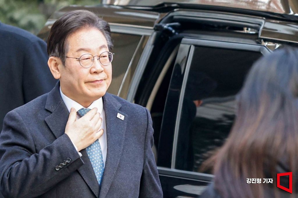 이재명 더불어민주당 대표가 26일 서울 서초구 서울중앙지방법원에서 열린 선거법 위반 사건 항소심 재판에 출석하고 있다.