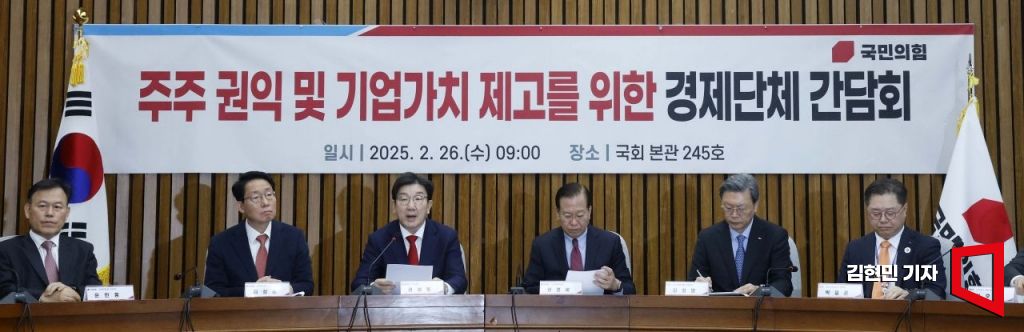 권성동 국민의힘 원내대표가 26일 국회에서 열린 주주 권익 및 기업가치 제고를 위한 경제단체 간담회에서 발언하고 있다.