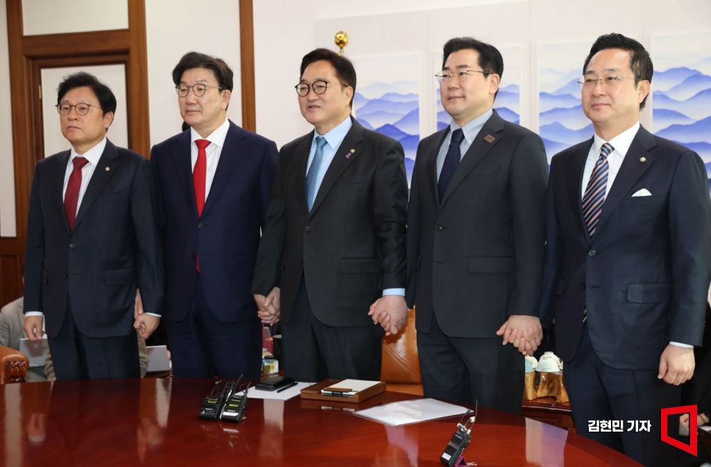 우원식 국회의장과 양당 원내대표가 26일 국회에서 회동하고 있다. 왼쪽부터 박형수 국민의힘 원내수석부대표, 권성동 국민의힘 원내대표와 우원식 국회의장, 박찬대 더불어민주당 원내대표, 박성준 더불어민주당 원내수석부대표.