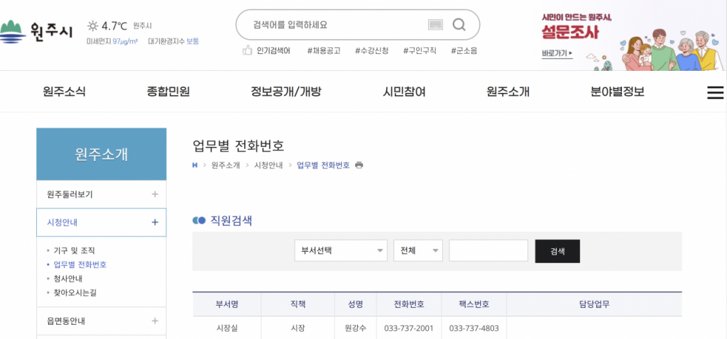 강원특별자치도 원주시청 홈페이지 내 직원들의 담당업무와 실명, 연락처가 공개되어 있는 '업무별 전화번호' 페이지 모습. 이미지=원주시청 홈페이지 캡처.