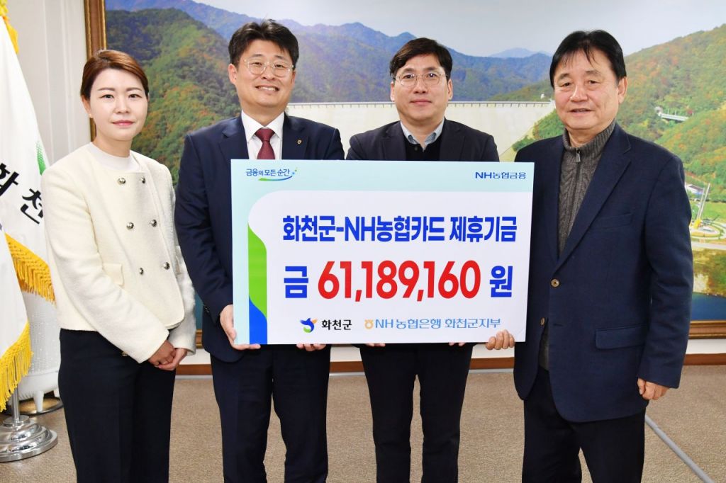 강원특별자치도 화천군(군수 최문순)은 26일, NH농협은행 화천군지부(지부장 민연홍)가 최문순 화천군 인재육성재단 이사장을 방문해 화천군과 NH농협카드 제휴기금으로 조성된 장학금 61,189,160원을 기탁했다고 밝혔다.