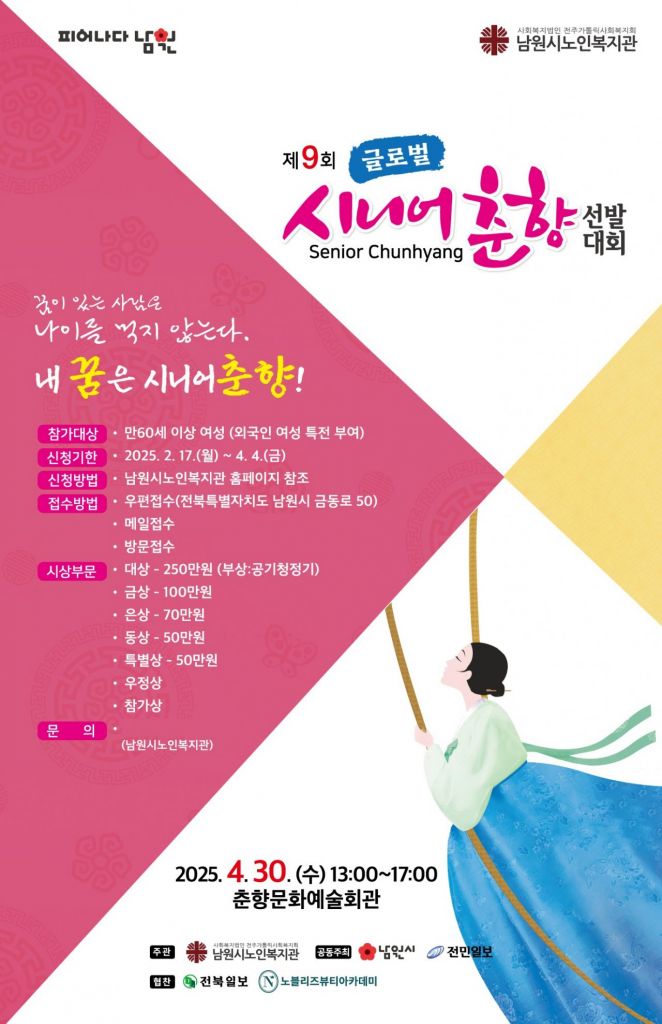 전북특별자치도 남원시는 오는 4월 30일 춘향문화예술회관 대공연장에서 '제9회 글로벌 시니어춘향 선발대회'를 개최한다고 26일 밝혔다.
