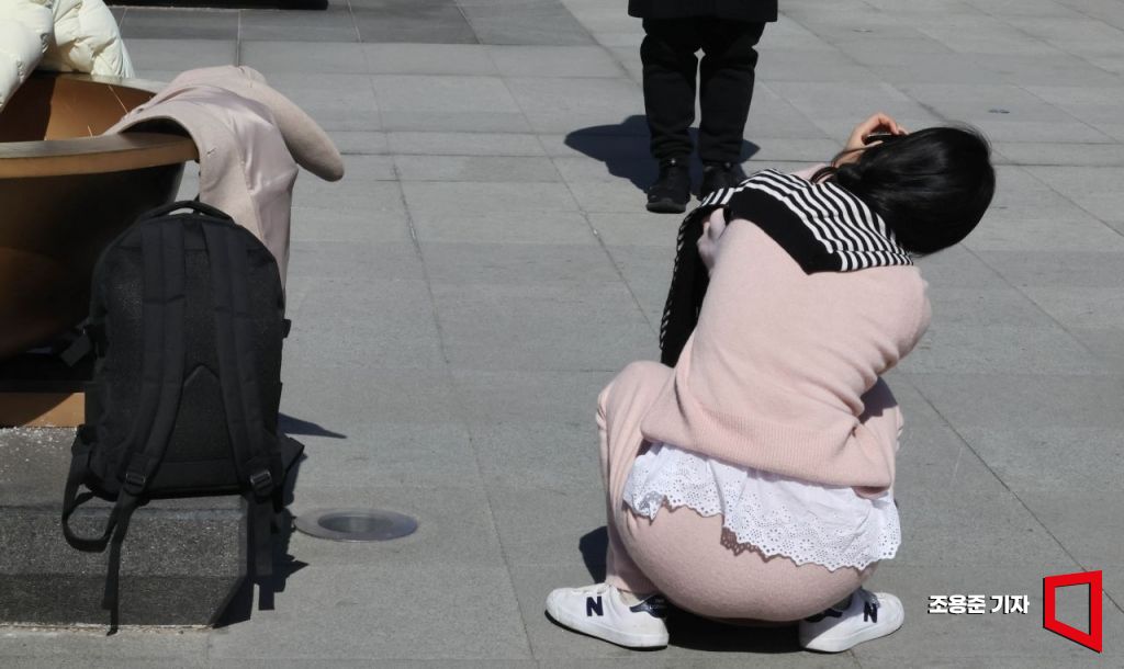서울 낮기온이 올라가면서 포근한 날씨를 보인 26일 종로구 광화문광장을 찾은 시민이 겉옷을 벗어 두고 사진을 찍고 있다.