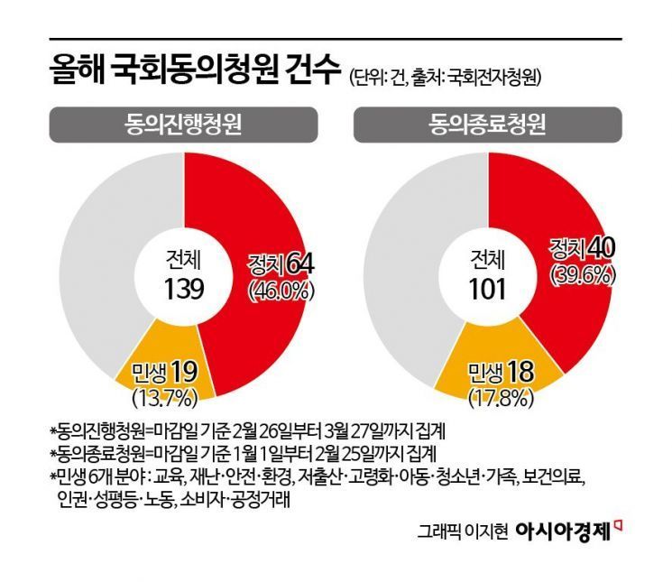 국회 상임위원회에 넘어간 청원에서도 정치 분야가 민생 분야를 앞서게 됐다. 동의 절차가 끝나기도 전에 상임위 회부가 확정된 올해 정치 분야 청원은 8건이지만 민생 분야는 0건이었다. 올해 동의종료청원의 경우 정치 분야에서 13건이었고, 민생 분야에서는 7건뿐이었다. 2022년 정치 2건, 민생 10건, 2023년 정치 1건, 민생 18건, 2024년 정치 3건, 민생 12건에서 결과가 뒤바뀐 것이다.