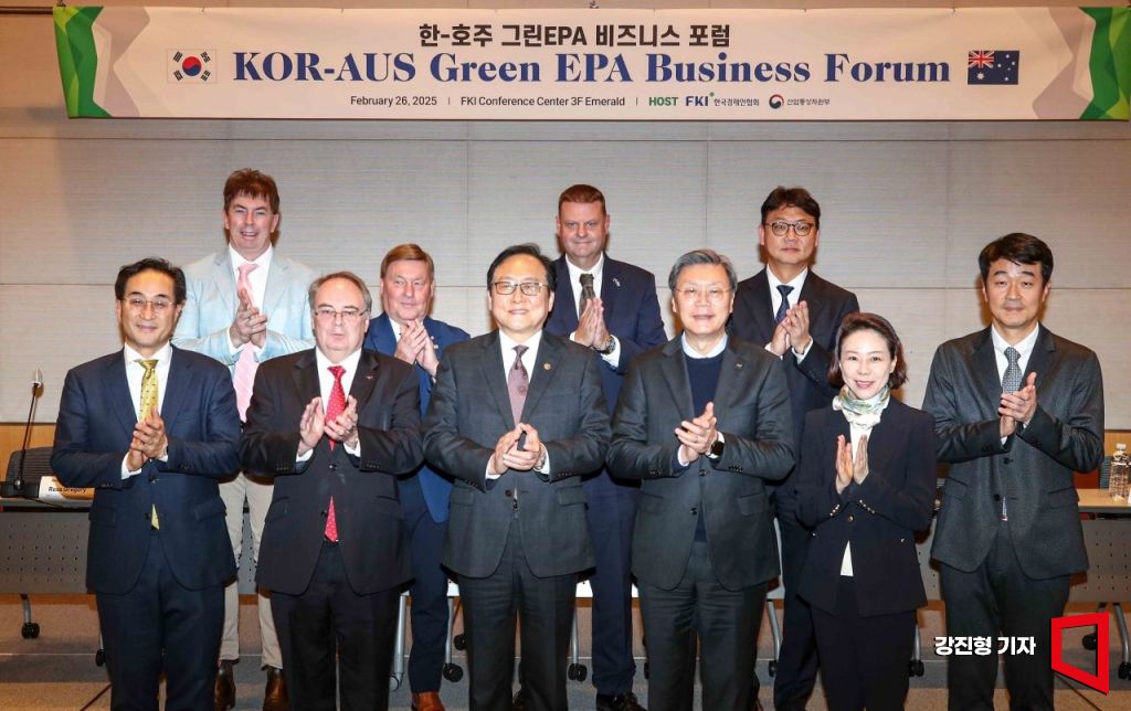 정인교(앞줄 왼쪽 세 번째) 산업부 통상교섭본부장과 제프 로빈슨(앞줄 왼쪽 두 번째) 주한호주대사를 비롯한 주요 내빈 및 강연자들이 26일 서울 여의도 FKI 타워 컨퍼런스센터에서 열린 '한-호주 그린 EPA 비즈니스 포럼'에 참석해 기념촬영을 하고 있다.