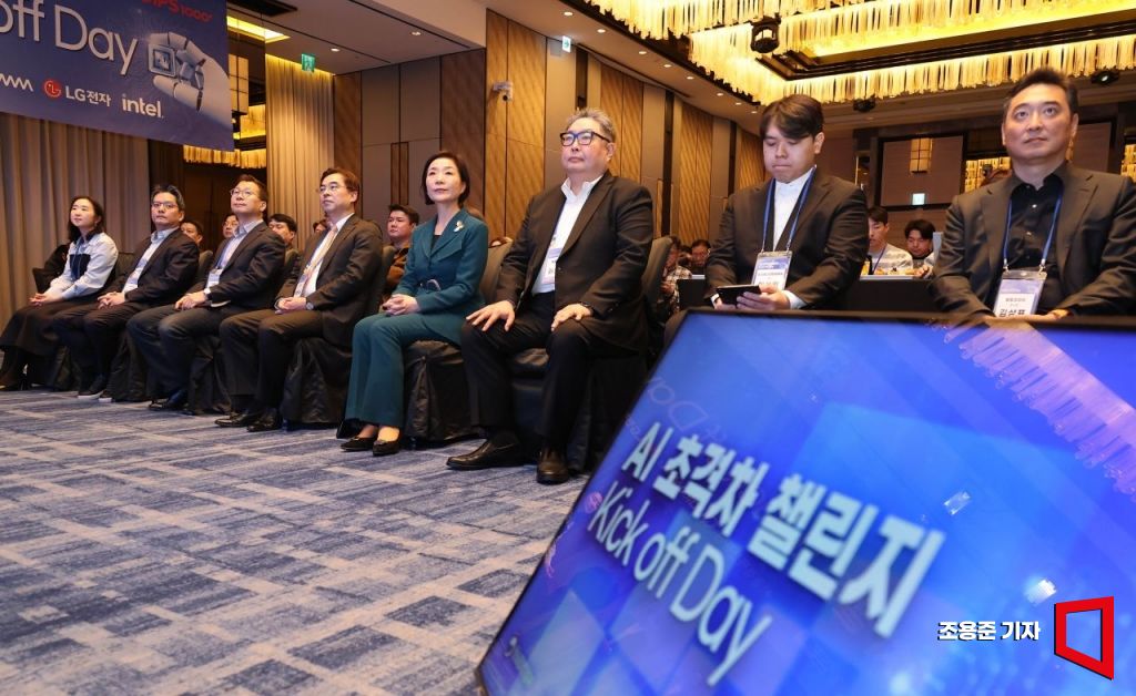 오영주 중소벤처기업부 장관을 비롯해 박형세 LG전자 사장, 권오형 퀄컴코리아 사장 등이 26일 서울 종로 포시즌스 호텔에서 열린 'AI 초격차 챌린지 Kick-off Day' 에 참석해 개막을 기다리고 있다. 2025.2.26 조용준 기자