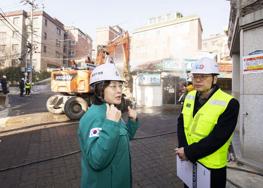 박희영 용산구청장(사진 왼쪽)이 한남3구역 위험건축물 철거 현장을 둘러보고, 공사 관계자에게 안전을 당부하고 있다. 용산구 제공.