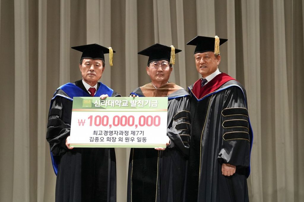 이날 수료하는 최고경영자과정 7기 원우회가 준비한 발전기금 1억원은 신라대학교 발전과 미래 세대 리더들에게 양질의 교육이 제공되길 바라는 마음으로 전달됐다.