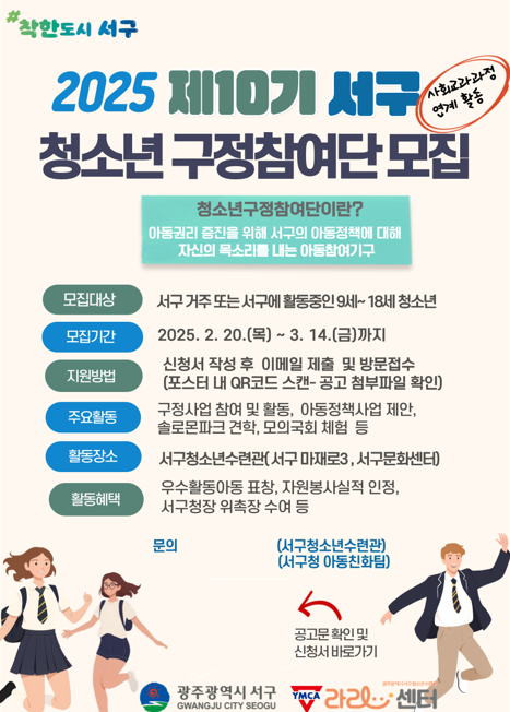 광주시 서구(구청장 김이강)는 ‘내 아이가 살고 싶어 하는 도시’조성을 목표로 ‘제10기 청소년 구정참여단’을 모집한다고 26일 밝혔다.