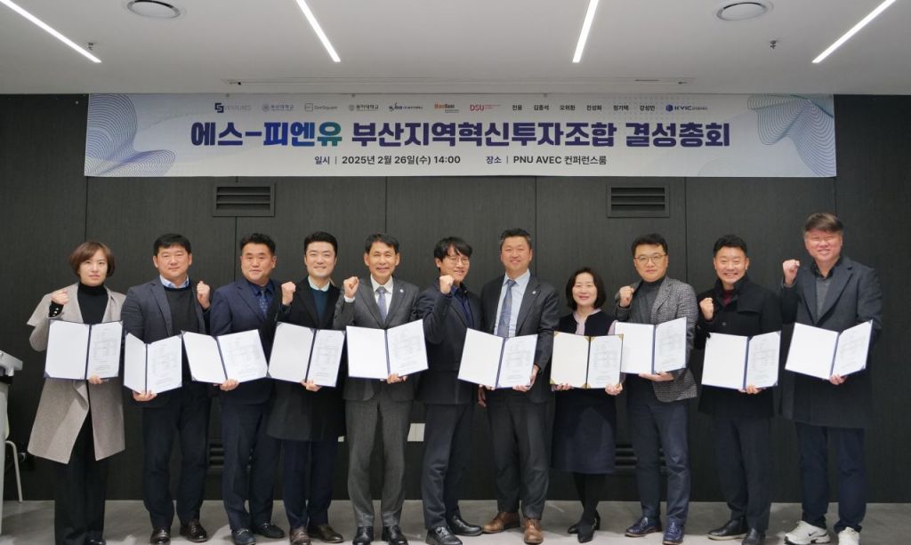 부산대학교(총장 최재원)는 부산대학교기술지주(대표이사 강정은)가 수도권 지역 전문 투자기관인 에스벤처스(공동대표이사 김현철·도승환)와 함께 부산 미래성장 벤처펀드의 자펀드인 '에스-피엔유 부산지역혁신투자조합' 결성총회를 26일 오후 PNU AVEC(부산대 기술창업 플랫폼)에서 개최했다.