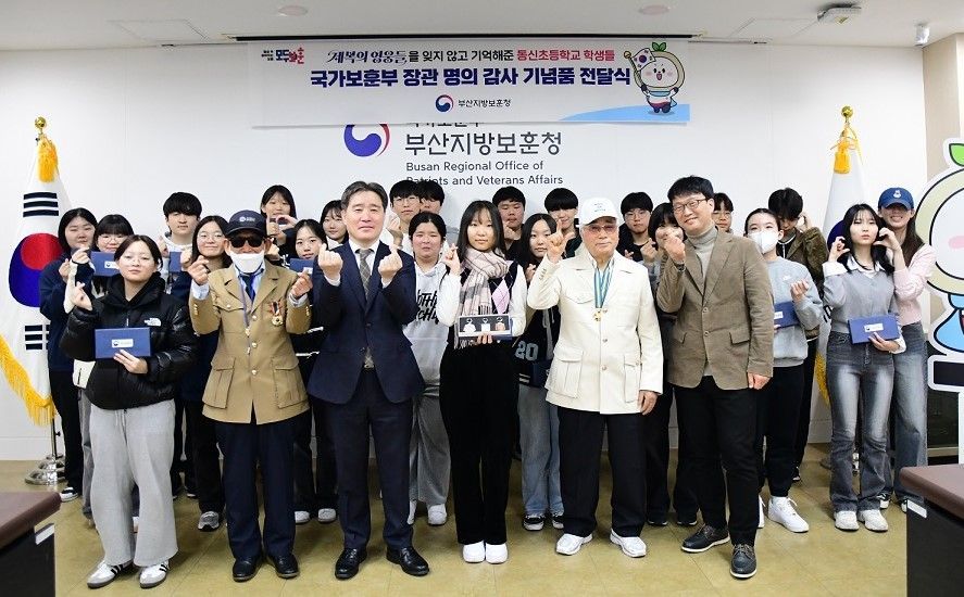 부산지방보훈청(청장 이남일)은 26일 백재석실에서 ‘참전유공자 제복’을 최초 제안(2021∼2022년)한 부산 동신초 학생들이 자부심을 느끼고 보훈문화 확산 주역으로 성장하도록 국가보훈부 장관 감사 기념품을 전달했다.