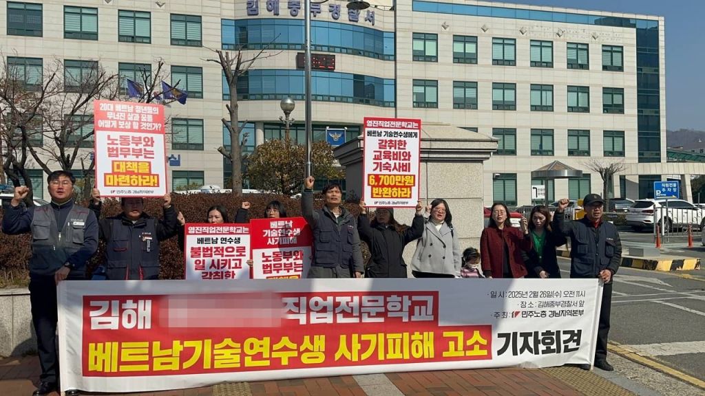 민주노총 경남지역본부는 26일 김해중부경찰서 앞에서 기자회견을 열고 “베트남 청년 13명이 A 직업전문학교 때문에 미등록체류자가 됐다”며 해결을 촉구했다.