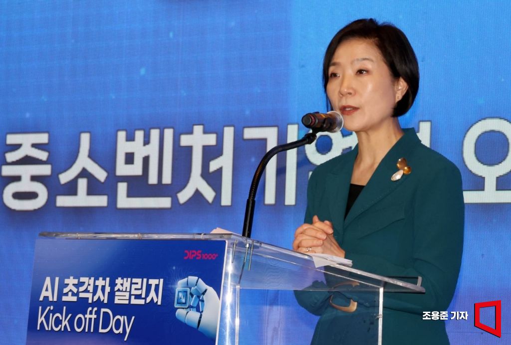 오영주 중소벤처기업부 장관이 26일 서울 종로 포시즌스 호텔에서 열린 'AI 초격차 챌린지 Kick-off Day' 에 참석, 인사말을 하고 있다. 2025.2.26 조용준 기자
