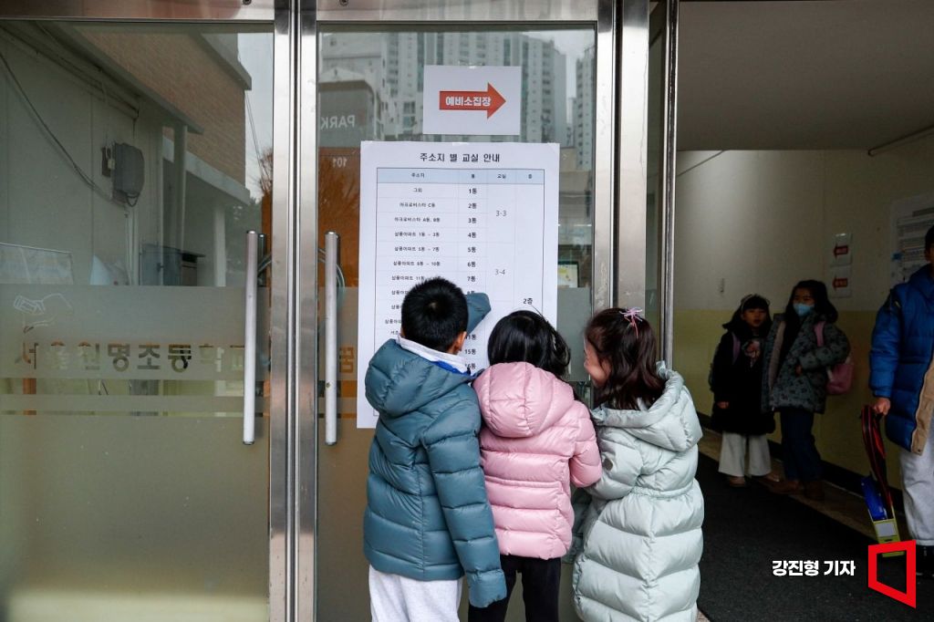 4일 서울 서초구 원명초등학교에서 열린 '신입생 예비소집'에서 예비 신입생들이 예비소집장을 확인하고 있다. 사진=강진형 기자aymsdream@