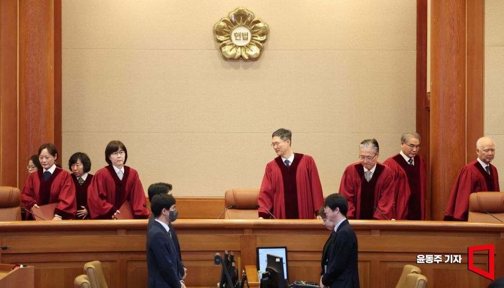 문형배 헌법재판소장 권한대행을 비롯한 헌법재판관들이 27일 서울 종로구 헌법재판소에서 열린 우원식 국회의장이 최상목 대통령 권한대행 부총리 겸 기획재정부 장관을 상대로 낸 마은혁 후보자의 임명 보류 관련 권한쟁의심판 등 사건에 참석하고 있다.