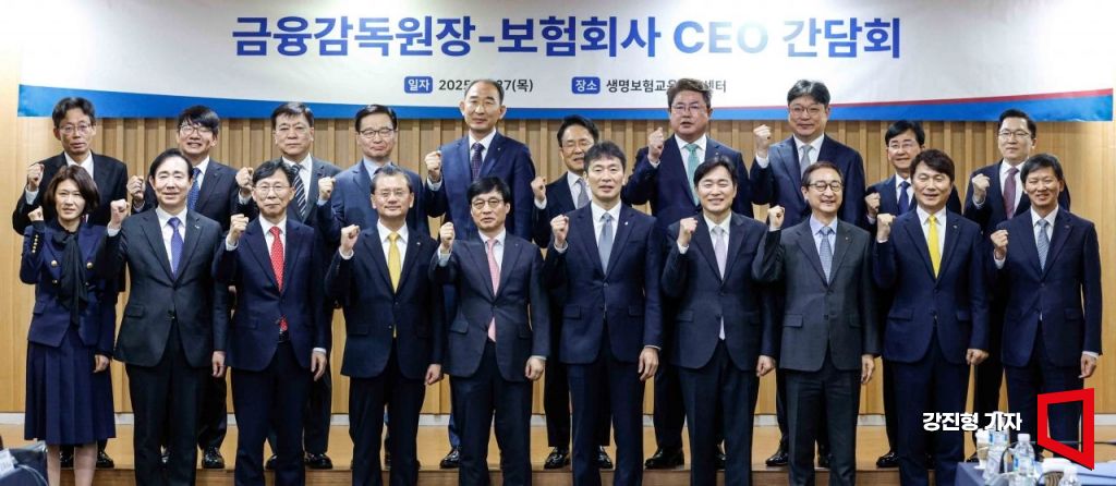 이복현(앞줄 왼쪽 여섯 번째) 금융감독원장과 김철주(앞줄 왼쪽 다섯 번째) 생명보험협회 회장, 이병래(앞줄 왼쪽 일곱 번째) 손해보험협회 회장을 비롯한 보험회사 대표들이 27일 서울 종로구 생명보험교육문화센터에서 열린 '금융감독원장-보험회사 CEO 간담회'에 참석해 사진촬영을 하고 있다.