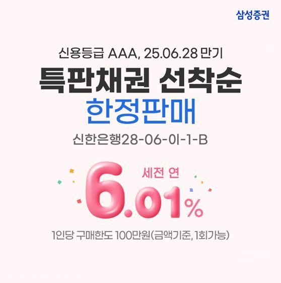 삼성증권은 비대면 신규 고객 대상으로 세전 연 6%대 특판 채권을 선착순으로 판매한다고 27일 밝혔다.