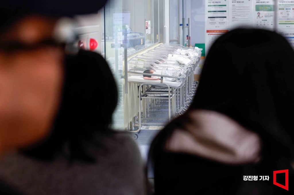 통계청이 지난해 출생아 수가 23만 8300명으로 1년 전보다 8300명 늘었다고 발표한 가운데 27일 인천 미추홀구 아인병원 신생아실 앞에서 신생아 부모 및 가족들이 창문 너머로 아이를 보고 있다.